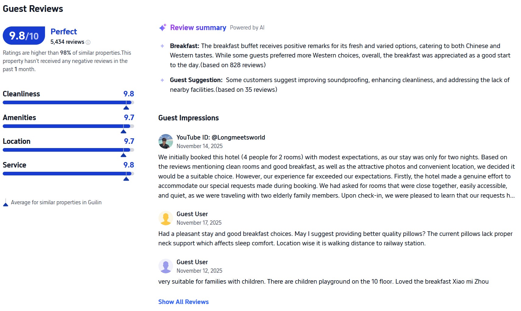 Forget generic hotel reviews. At LiCLOUDS HOTEL (Guilin Two Rivers and Four Lakes Xiangshan Park), the guest experience isn’t just rated—it’s celebrated. With a staggering 9.8/10 rating from over 5,434 verified reviews on Trip.com—and not a single negative review in the past month—this 4-star gem isn’t just popular; it’s beloved. Travelers aren’t just checking in; they’re creating unforgettable memories, thanks to a perfect storm of smart design, exceptional service, and a location that places Guilin’s most iconic sights at your doorstep.